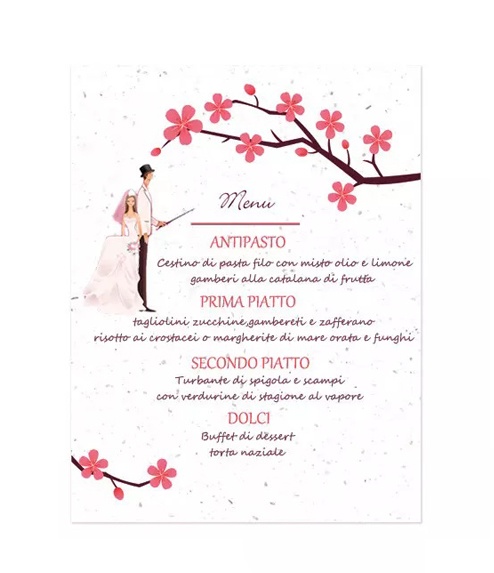 It is always advisable to include options for vegetarians and vegans on the wedding menu, which denotes attention and respect for guests’ tastes and choices. If so, presenting the menu on paper with non-GMO seeds is a perfect choice and an interesting match.